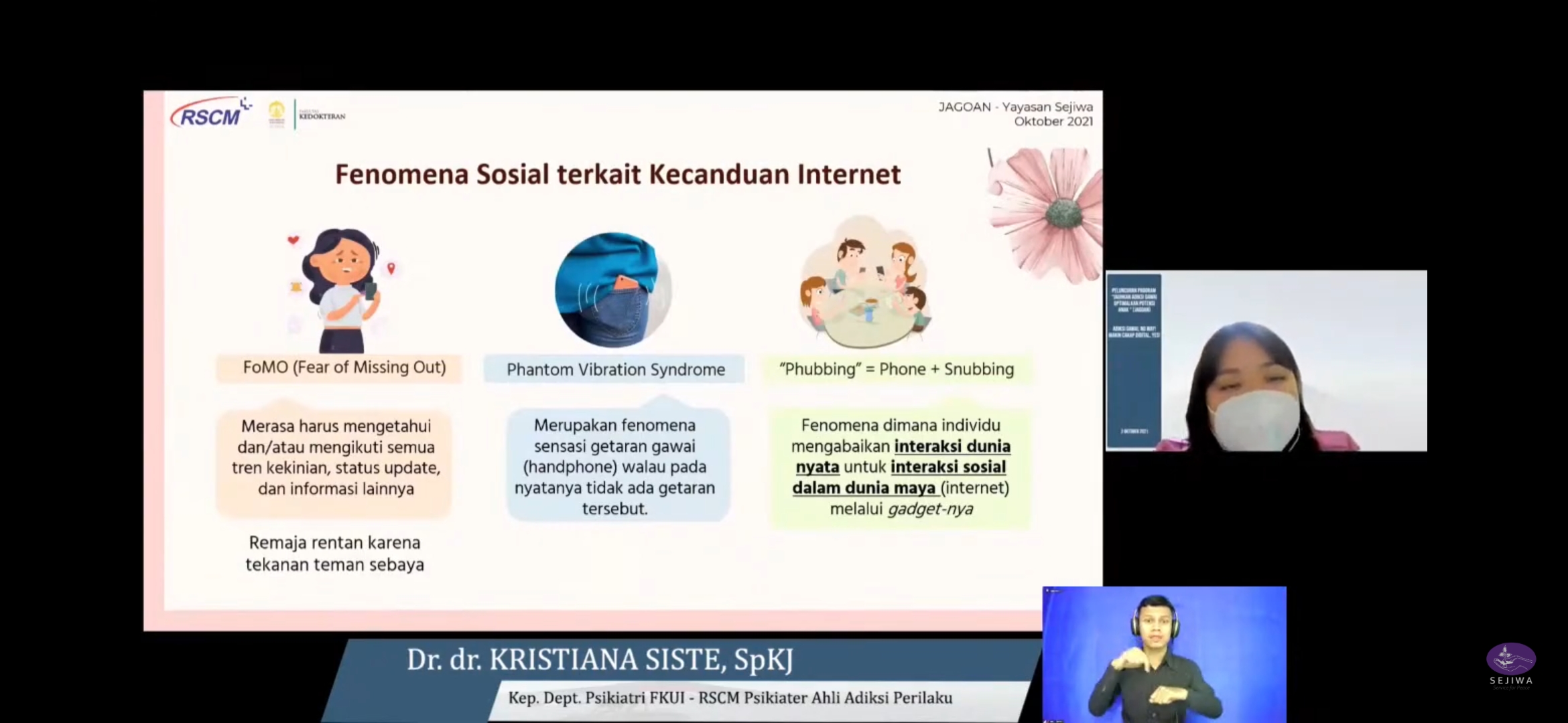 Hasil penelitian yang dilakukan oleh dr. Kristiana Siste, dr. Enjeline, dan tim Divisi Psikiatri Adiksi Departemen Ilmu Kesehatan Jiwa FKUI-RSCM di 34 provinsi di Indonesia selama masa pandemi COVID-19 pada bulan Mei-Juli 2020 menunjukkan bahwa angka kecanduan internet mencapai 19,3% pada remaja dan 14,4% pada dewasa muda.