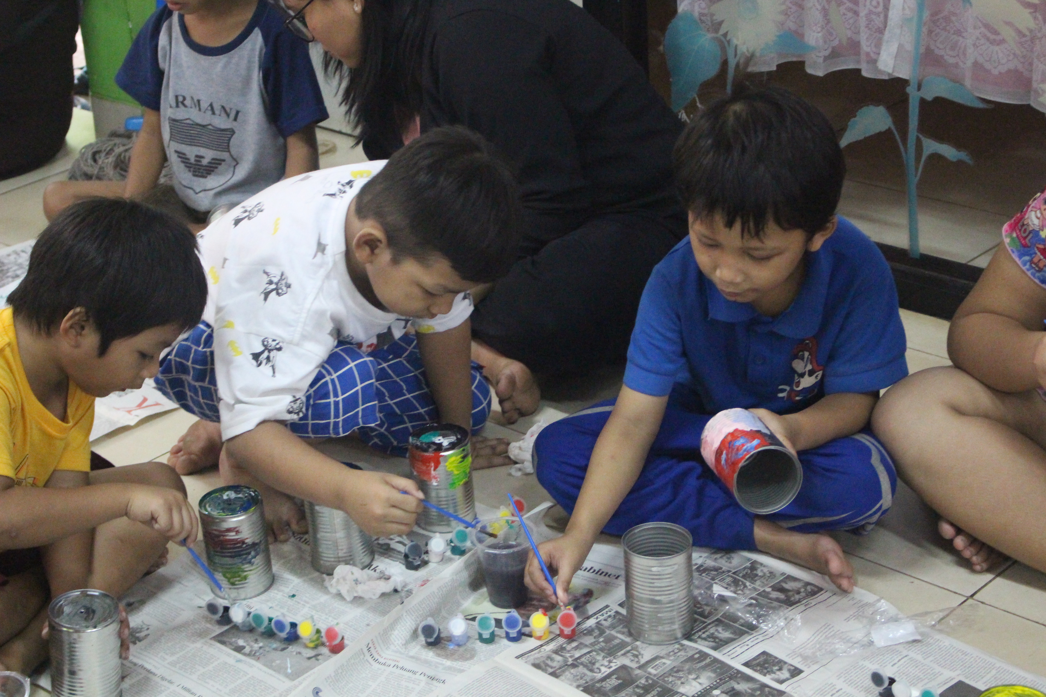 Nah, kegiatan selanjutnya yaitu workshop membuat telepon kaleng. Setiap anak dibagikan bahan dan alat untuk membuat telepon kaleng. Kegiatan ini dilakukan untuk menambah ilmu tentang sampah dan lingkungan serta sebagai media dalam melatih kreativitas bagi anak-anak.