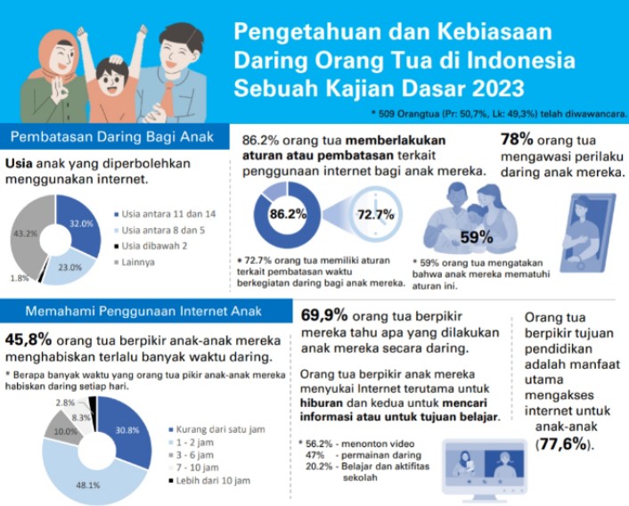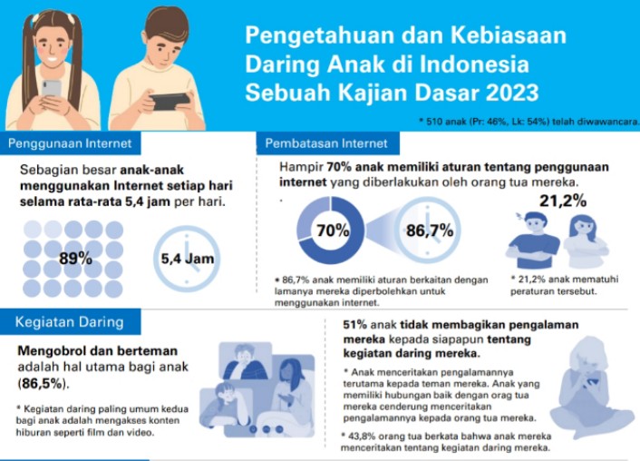 Berdasarkan riset UNICEF yang dilakukan oleh di atas, sebesar 86,2 persen orang tua memberlakukan aturan pembatasan penggunaan internet terhadap anak, 78 persen orang tua mengawasi perilaku daring anak mereka. Lalu, 59 persennya orang tua menyatakan anak-anak mematuhi aturan pembatasan penggunaan internet.
