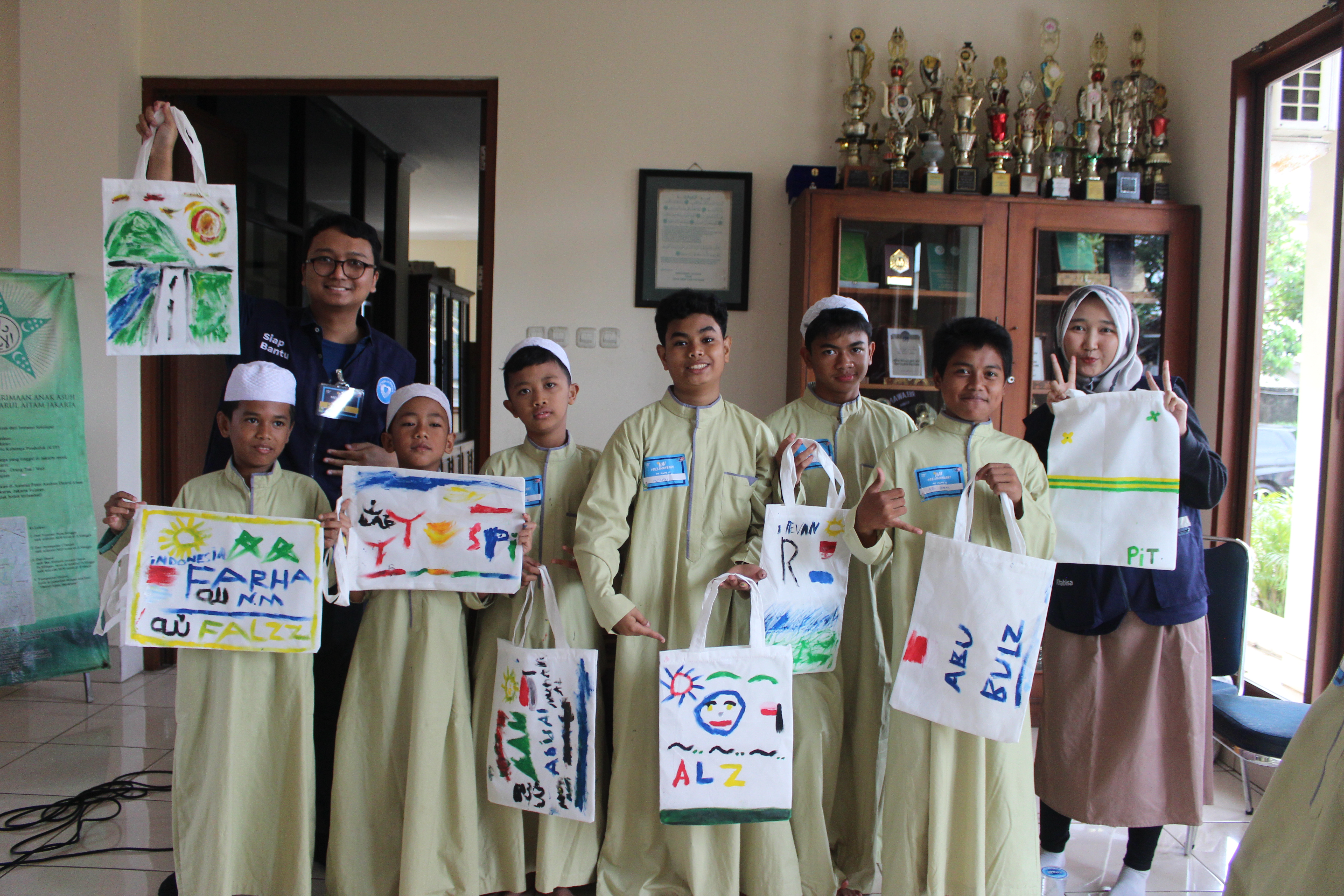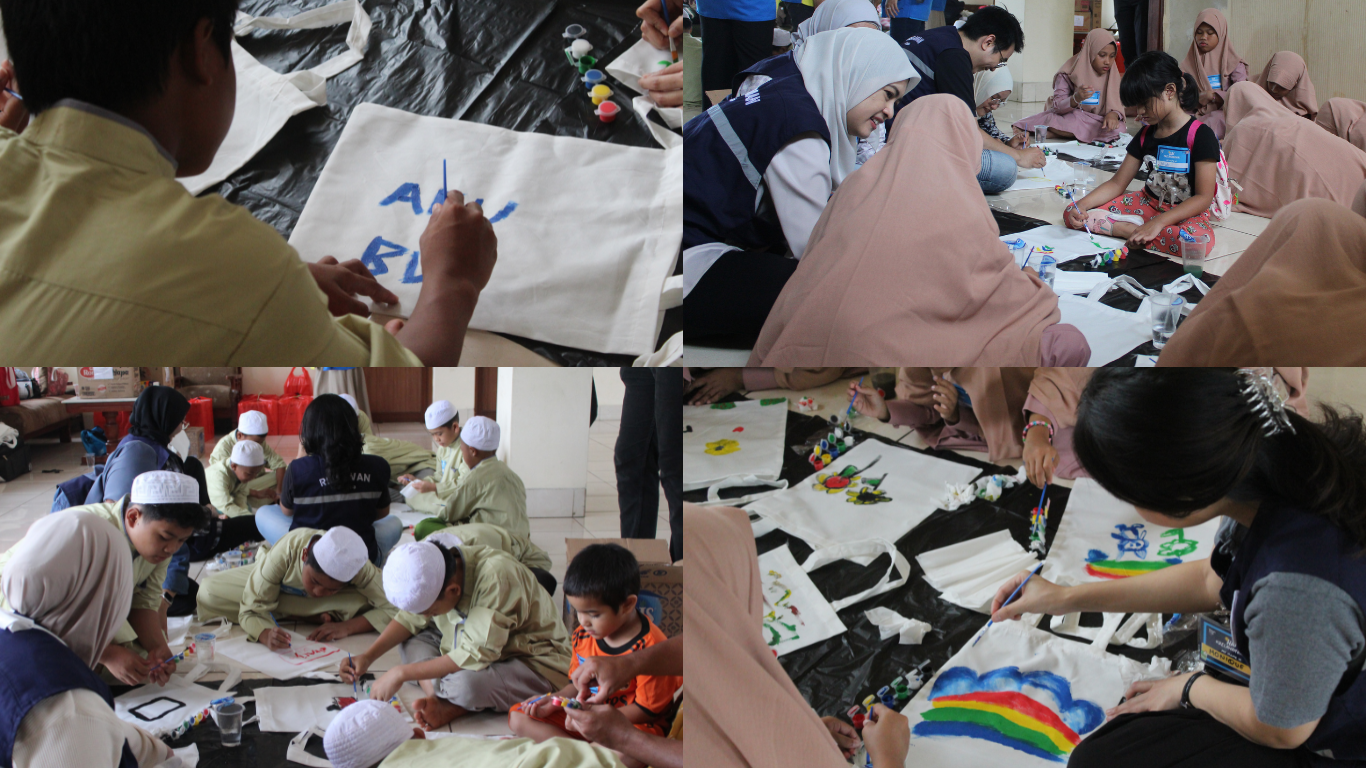Sekitar empat puluh menit menghabiskan waktu dengan cat air yang mulai menghiasi tangan dan tote bag kanvas putih, adik-adik binaan pun mulai mengeringkan tote bag karya mereka sambil menuju ke rangkaian acara berikutnya. Lihat deh hasil karya mereka, gemes banget kan?