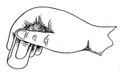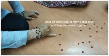 Pemain yang mendapatkan giliran pertama menyebarkan biji, kemudian menyendok biji satu persatu dengan daun sawo kecik tanpa menyentuh biji lain. Cara memegang daunnya adalah sebagai berikut.