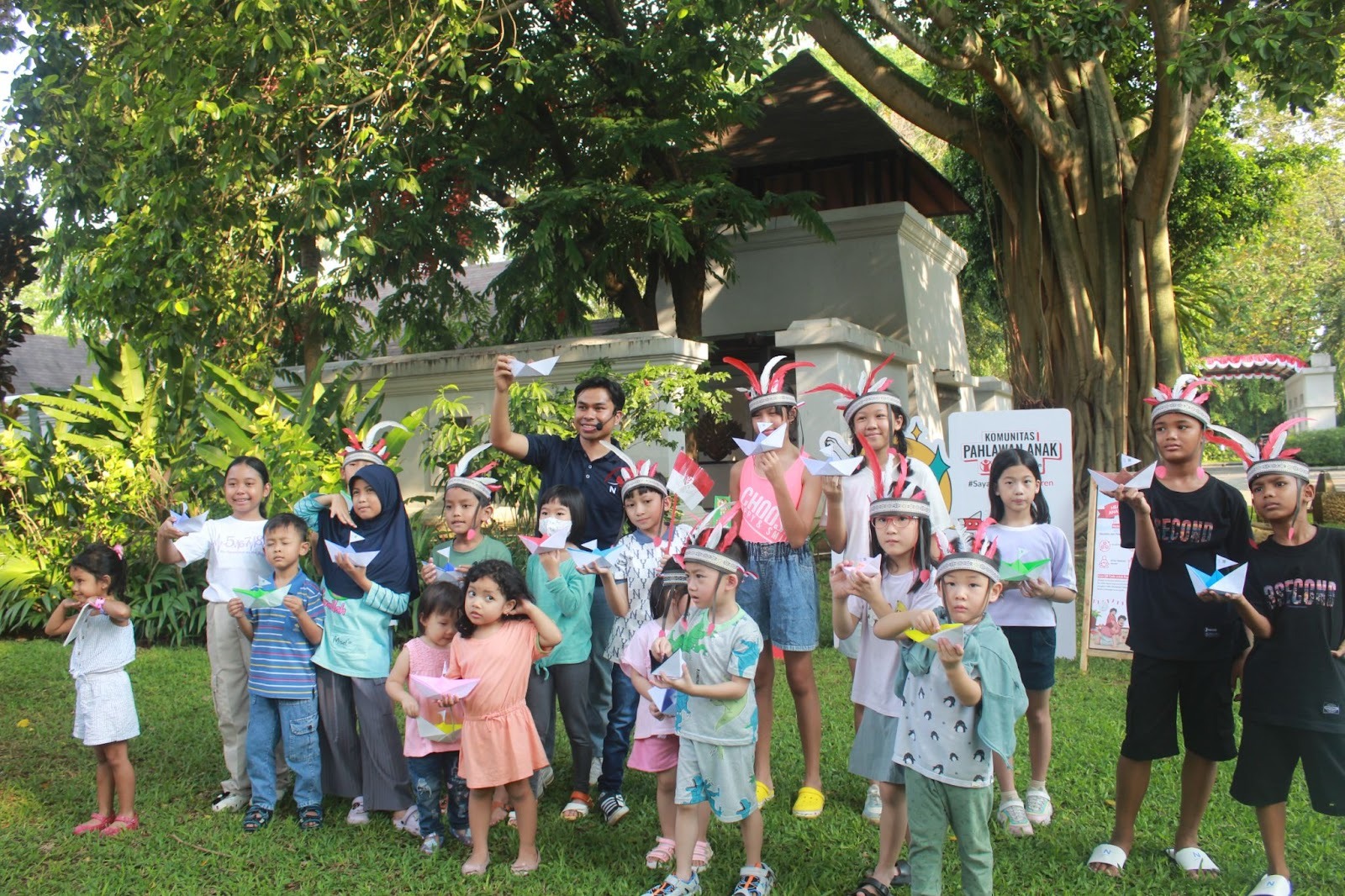 Eh, tetapi mahkota cendrawasih yang dibuat oleh adik-adik pengunjung tentunya bukan dari bulu burung cendrawasih sungguhan ya, hehehe! Setelah merangkai bersama, adik-adik pengunjung memakai mahkota tersebut sebagai rasa bangga terhadap kreasi yang mereka buat.