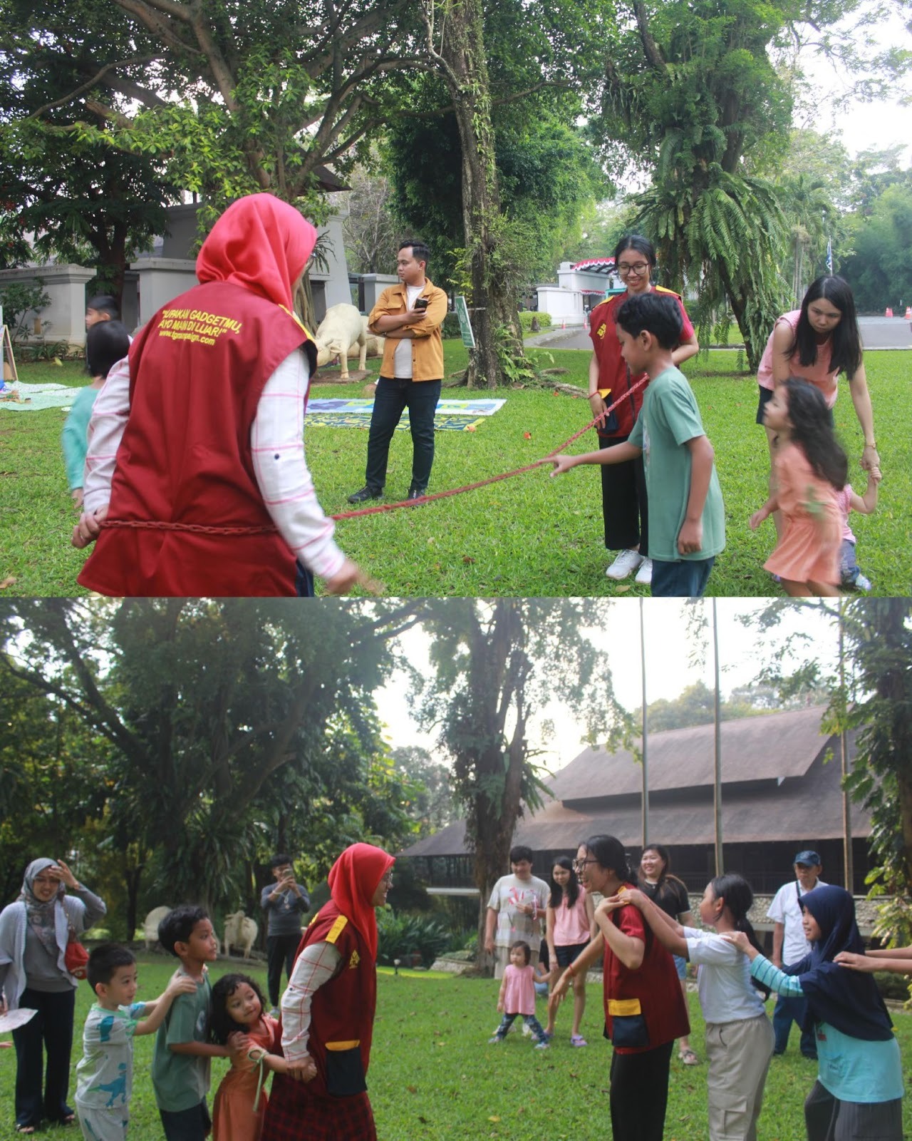 Selanjutnya, adik-adik pengunjung juga diajak bermain permainan yang gak kalah energik dan seru, yaitu permainan tali karet. Adik-adik harus melompati dan melewati tali karet yang dipegang oleh Tim TGR.