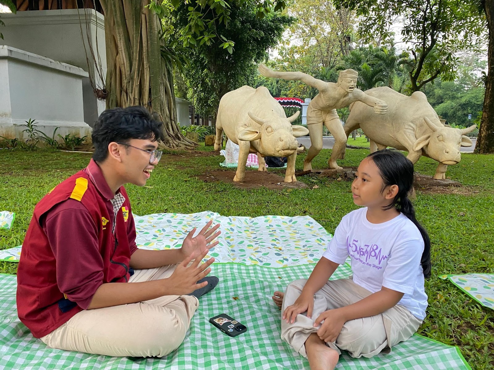 Kak Nina mulai mengajak adik-adik pengunjung membuat lingkaran besar. Mereka menggandeng tangan teman di sampingnya yang dipandu oleh Tim TGR. Nah, kalau sudah buat lingkaran seperti ini, tandanya sudah masuk ke sesi ice breaking!
