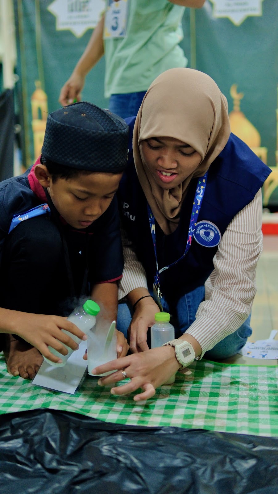 Di Pos 3, adik-adik diajak bereksperimen dengan dry ice yang menghadirkan pengalaman belajar yang seru dan edukatif. Mereka terlihat antusias saat menyaksikan reaksi unik dari dry ice, sambil mendapatkan penjelasan sederhana dari kakak relawan. Rasa penasaran dan kekaguman pun terlihat jelas dari wajah adik-adik.