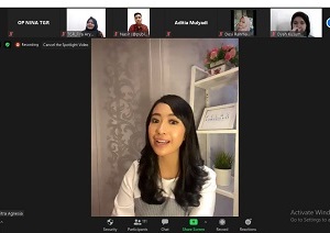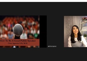 Setelah sesi foto bersama, sesi berikutnya ialah pemaparan materi. Kak Citra mengawali pemaparan materi dengan menceritakan pengalamanya sebagai presenter dan sembari menanyakan ke peserta webinar hal-hal apa saja yang dihadapi ketika berbicara didepan banyak orang. Salah satu yang menyampaikan pendapat adalah Dyah – ia memberikan pandangannya ketika diminta berbicara di depan ribuan orang, hal yang pertama kali muncul adalah perasaan gugup, terbata-bata dalam berbicara, tidak fokus dan bahkan akan merasa sakit perut sebelum naik panggung.