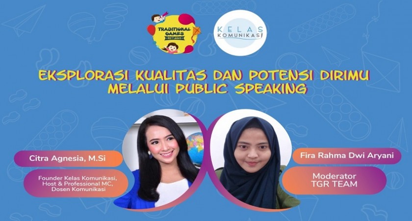 Jakarta, 8 November 2020 - Traditional Games Returns (TGR) Community menyelenggarakan webinar tentang public speaking dengan narasumber Kak Citra Agnesia, seorang presenter pada program di televisi dan founder Kelas Komunikasi. Tujuan dari kegiatan ini adalah untuk memberikan pemahaman mengenai teknis dan seni dalam membentuk soft skill pribadi, khususnya ketika berbicara di depan umum. Acara dimulai pada pukul 15.00 WIB dan dibuka oleh Kak Fira sebagai moderator yang diawali dengan sesi foto bersama.