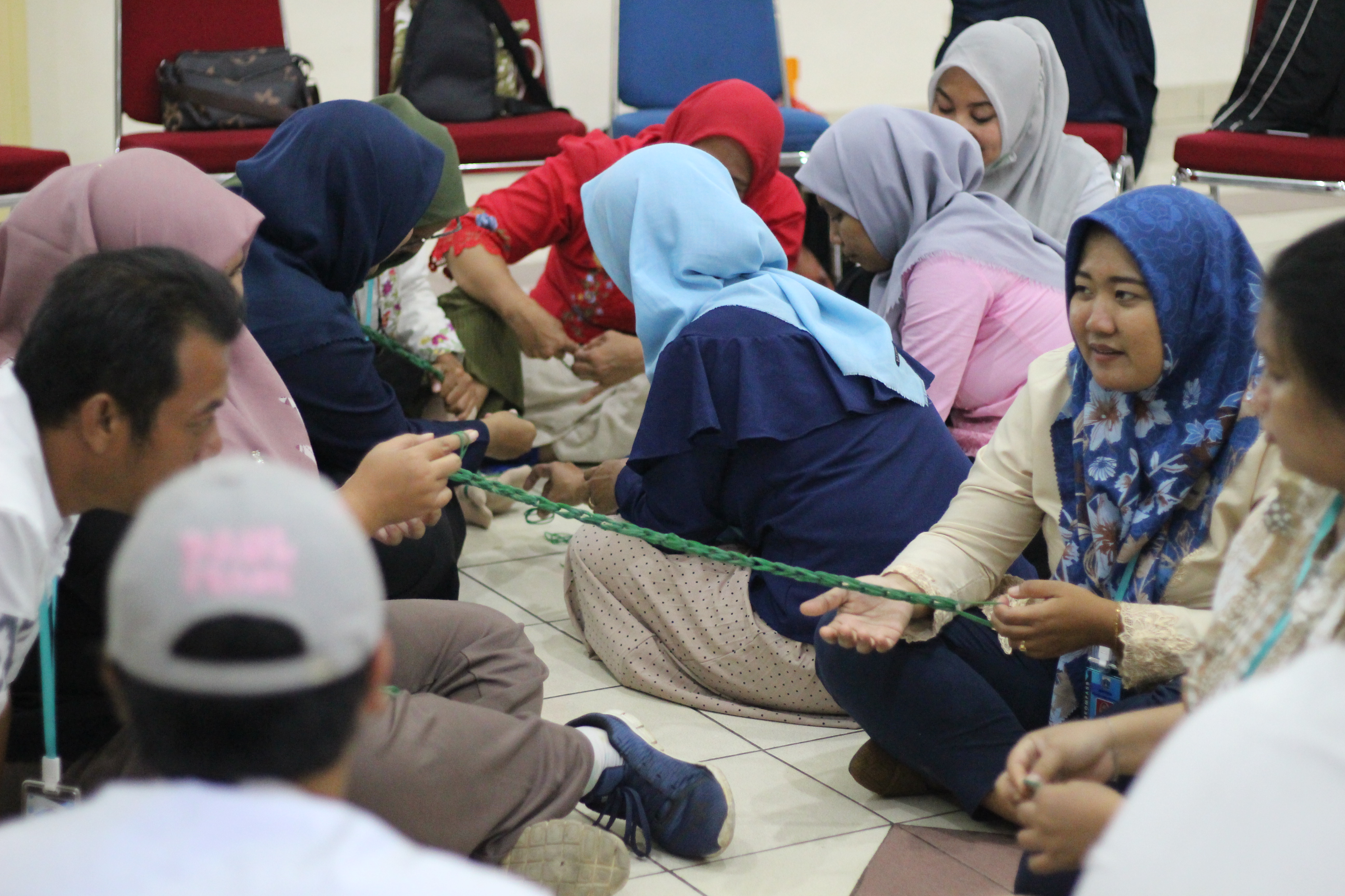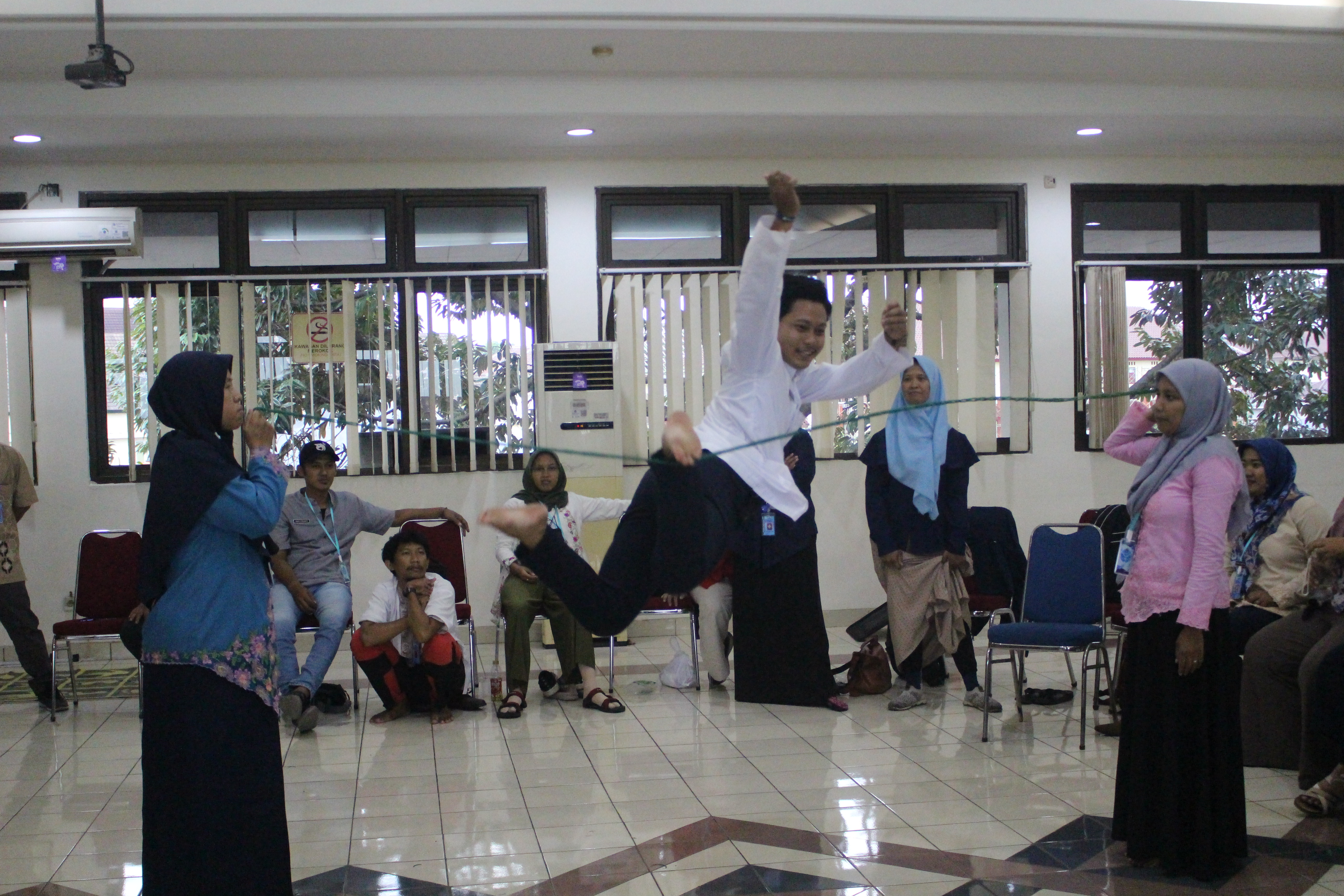 Usai mencoba permainan tanpa alat tibalah saatnya membuat mainan sendiri. Para pengelola ditantang untuk merangkai karet menjadi tali panjang untuk bermain lompat karet. Ada yang mencoba dengan jari jemari hingga kaki. Para pengelola berlomba merangkai tali yang paling panjang. Bukan hanya mencoba membuat, tapi juga langsung dimainkan dengan lincah. Para pengelola tertantang untuk loncat mulai dari level tanah hingga merdeka. Luar biasa energik dan atraktif!