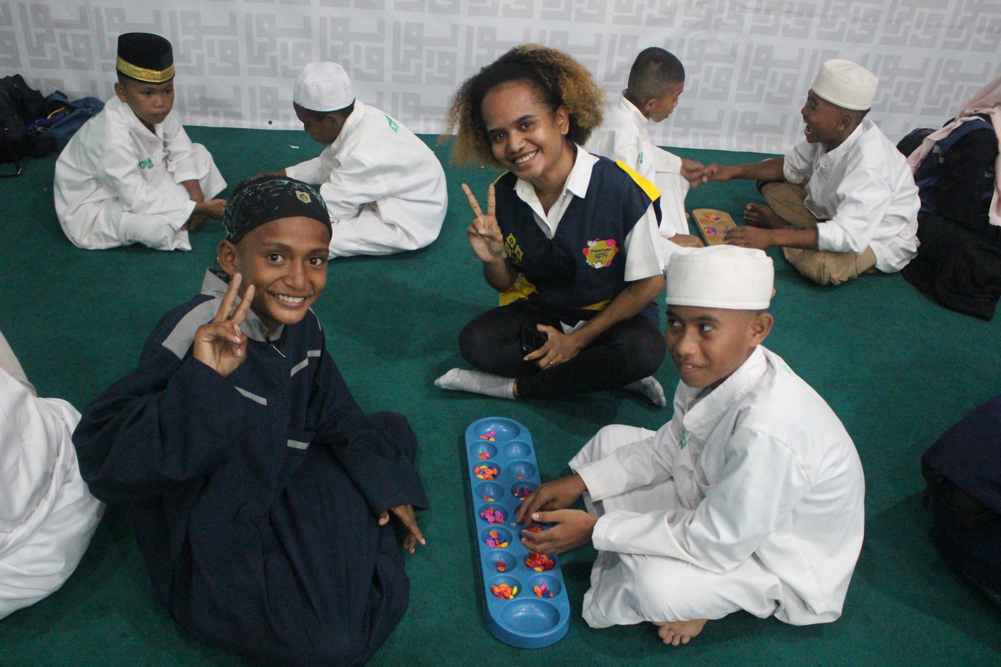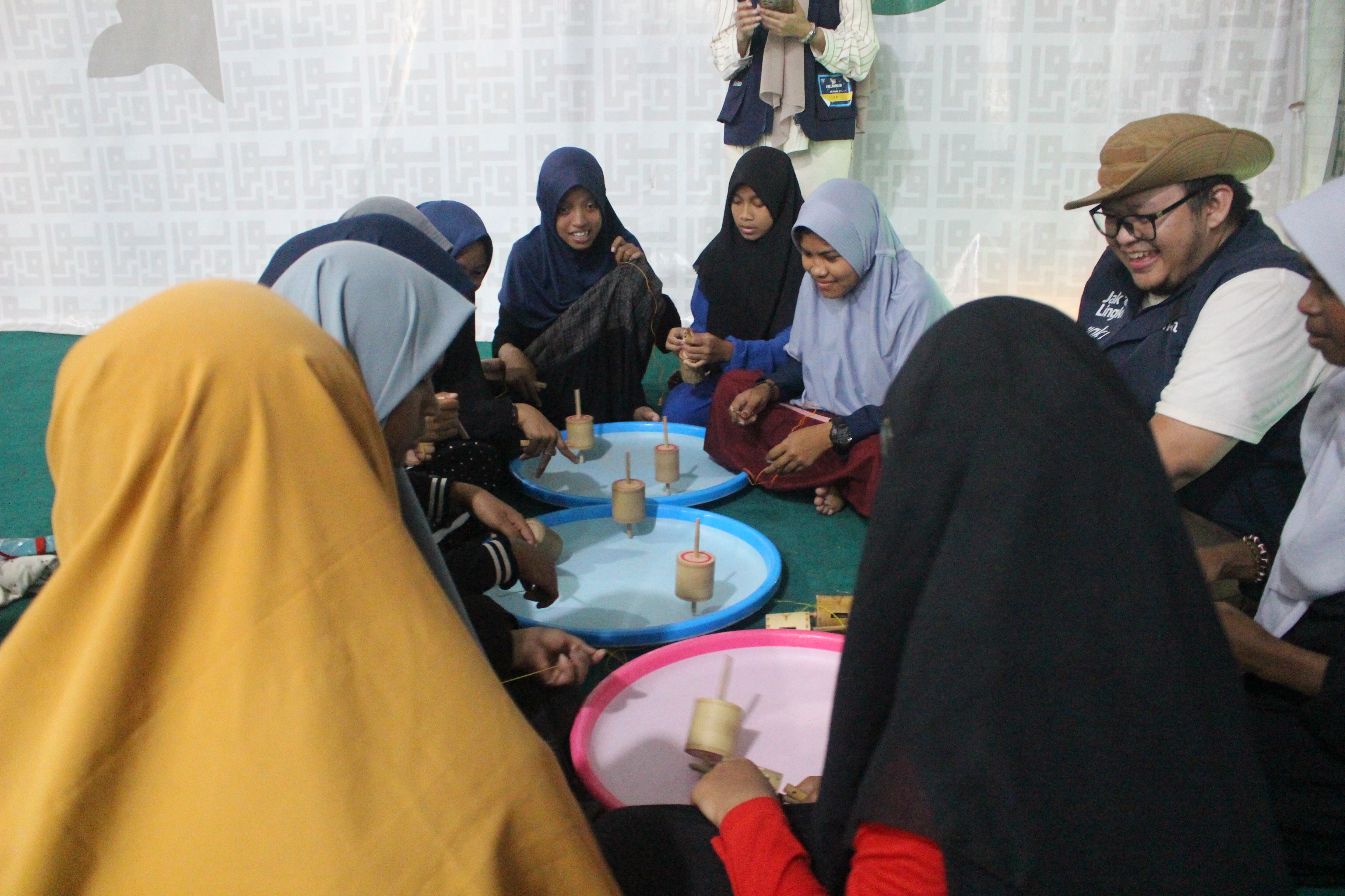 Tahu nggak sih Sobat, saat kegiatan bermain permainan tradisional mau dimulai, tiba-tiba hujan turun cukup deras. Kegiatan yang seharusnya dilakukan di lapangan pondok pesantren ini harus dipindahkan ke dalam aula. Ada 10 permainan yang dimainkan seperti congklak, keprayan, gasing bambu, ular tangga, dampu bulan dan permainan jejak, lompat karet, balap kelereng, balap karung, bakiak batok, serta bulldozer.