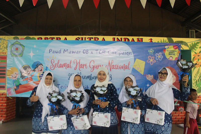Tidak hanya itu, perwakilan adik-adik dari Paud Mawar 08 mengucapkan selamat hari guru dan berterima kasih kepada guru-guru yang selama ini telah membimbing mereka dalam belajar. Tak lupa, mereka menyerahkan hadiah berupa bunga dan hadiah yang telah dibungkus rapi kepada para guru tersayang.