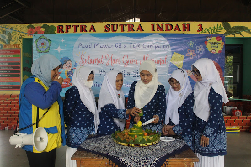 Setelah waktu istirahat habis, adik-adik diminta untuk kembali berkumpul dan menyaksikan acara peringatan Hari Guru Nasional. Acara peringatan hari guru yang masih dipandu oleh Tim TGR dibuka dengan sambutan dari Ibu Tian selaku Kepala Sekolah dari Paud Mawar 08. Setelah sambutan selesai, dilanjut dengan potong tumpeng bersama.