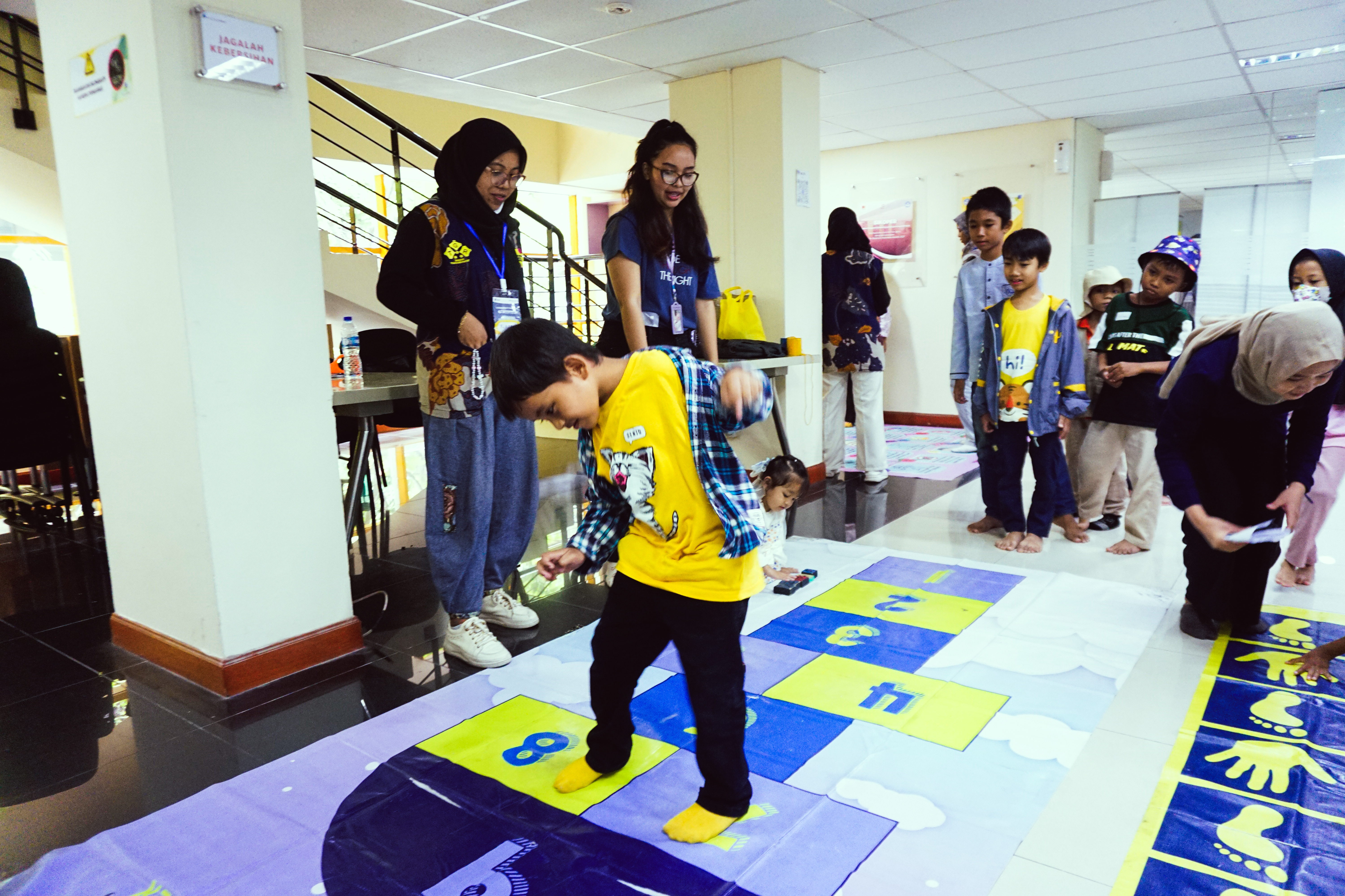 Bermain jejak terlihat sulit dan butuh konsentrasi nih Sobat TGR! Karena kita harus bisa meletakkan tangan maupun kaki yang sesuai. Terkadang adik-adik masih kebingungan, kaki atau tangan sebelah mana yang harus digerakkan. Tapi dari sini, mereka jadi semakin penasaran dan mencobanya berulang kali.