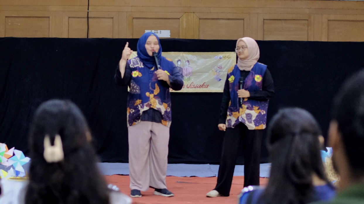 Usai mendengarkan sambutan, kini saatnya Tim TGR yang diwakilkan oleh Aghnina dan Salsha mengenalkan permainan tradisional Indonesia kepada khalayak! Memulai perkenalan dengan sapaan hangat dan mengajak para peserta untuk mengangkat tangan sambil mengucapkan “Hompimpa Alaium Gambreng!” Kami juga menjelaskan bahwa hompimpa bermakna “Dari Tuhan, kembali ke Tuhan, mari kita bermain!”