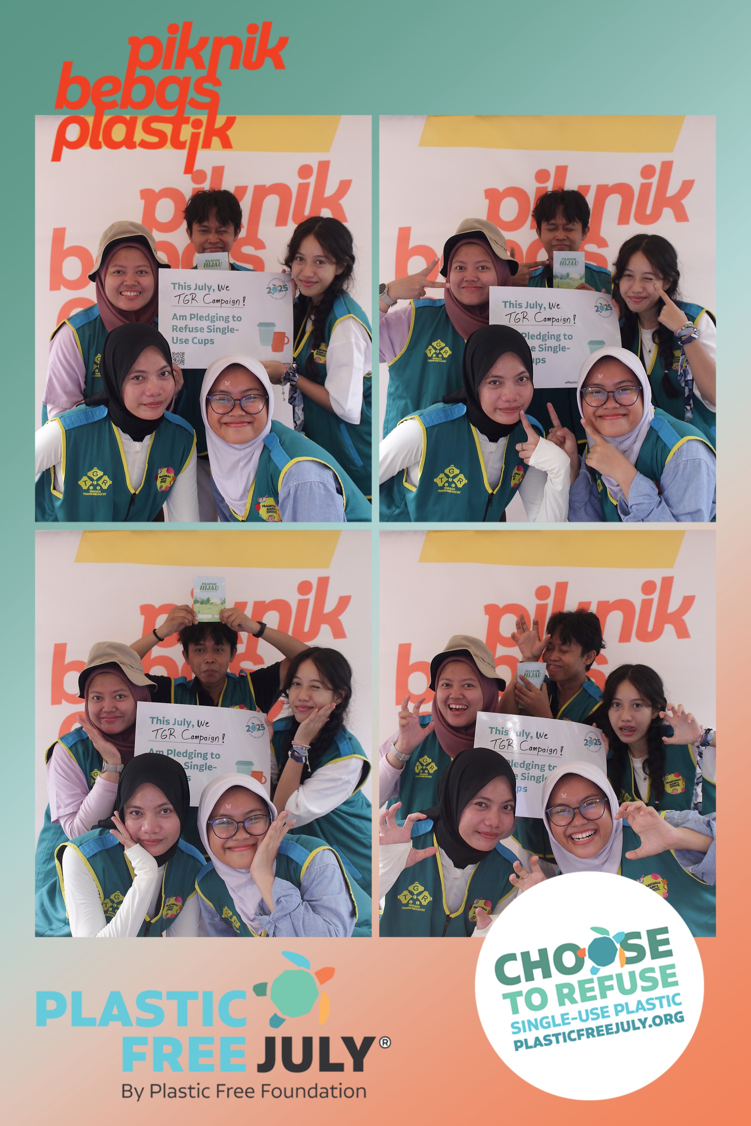 Tidak lupa Tim TGR pun juga ikut berfoto untuk mendukung kegiatan ini dan berkomitmen untuk mengurangi penggunaan plastik sekali pakai. Hasil fotonya pun sangat lucu dan penuh keceriaan, menggambarkan semangat positif yang mereka bawa. Nah, gimana nih menurut Sobat TGR?