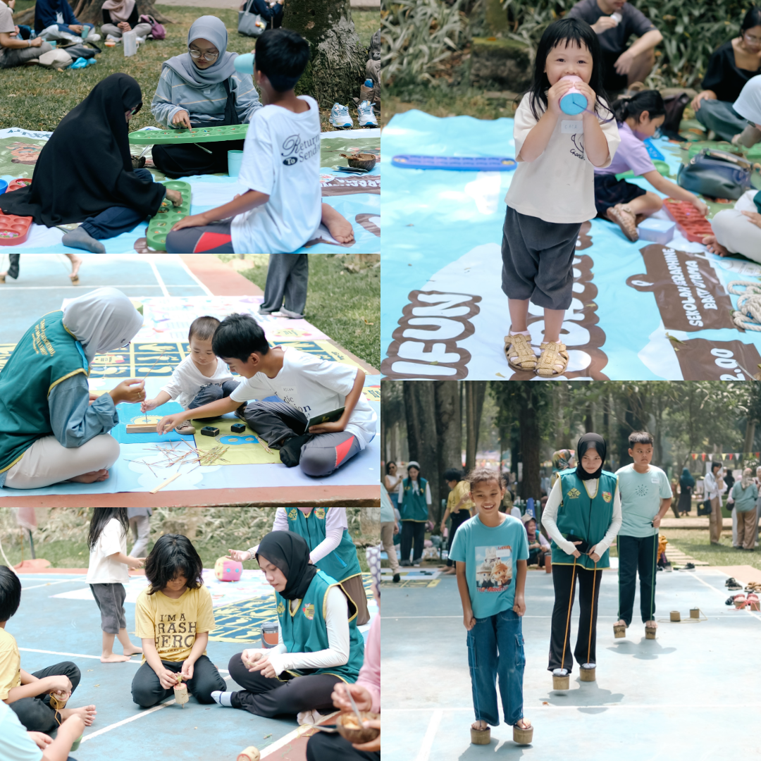 Wah, jadi selain bermain dan bersenang-senang anak-anak juga bisa mengenal permainan tradisional. Keseruan bermain tidak hanya sampai sana, beberapa kakak-kakak panitia juga mencoba untuk ikut bermain bersama anak-anak. Mereka membuat challenge bermain egrang cepat-cepatan sampai di ujung lapangan.